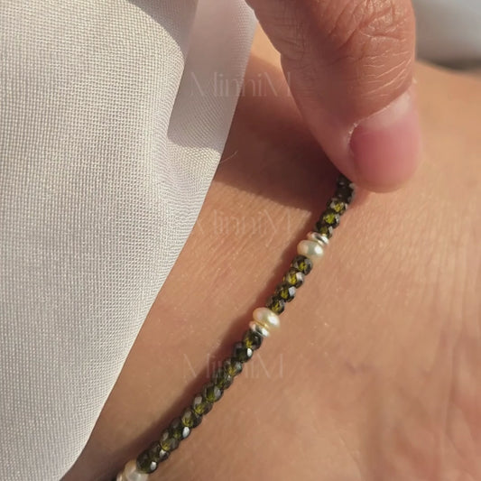 Olive Zircon Anklet with Freshwater Pearls in 925 Sterling Silver