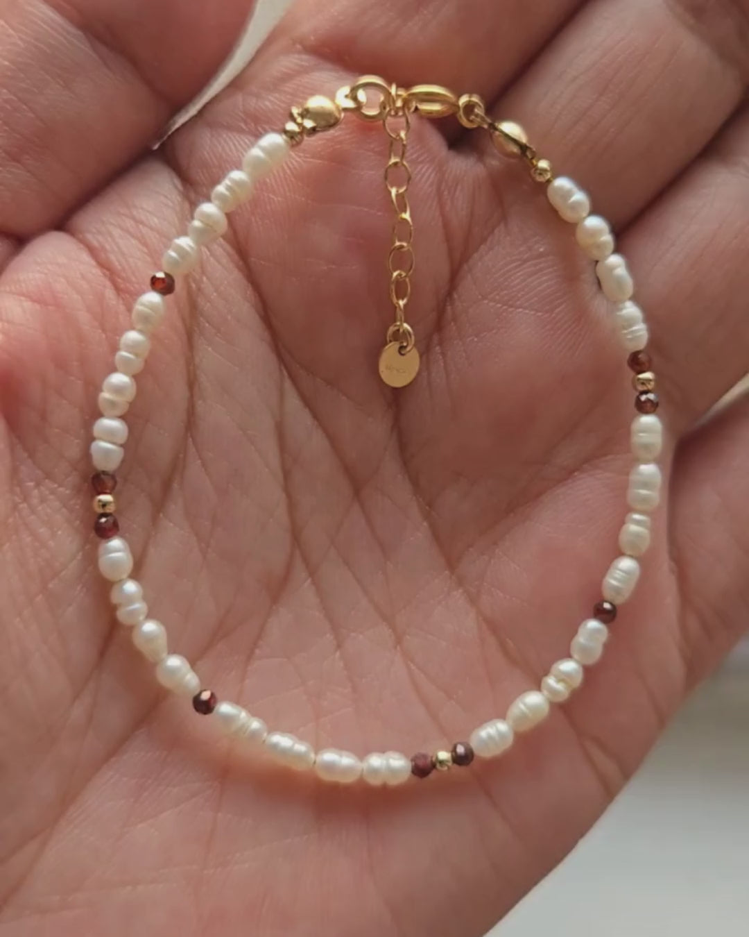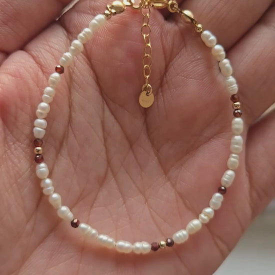 Rare Maroon Zircon and Freshwater Pearl Bracelet in 14k Gold Filled